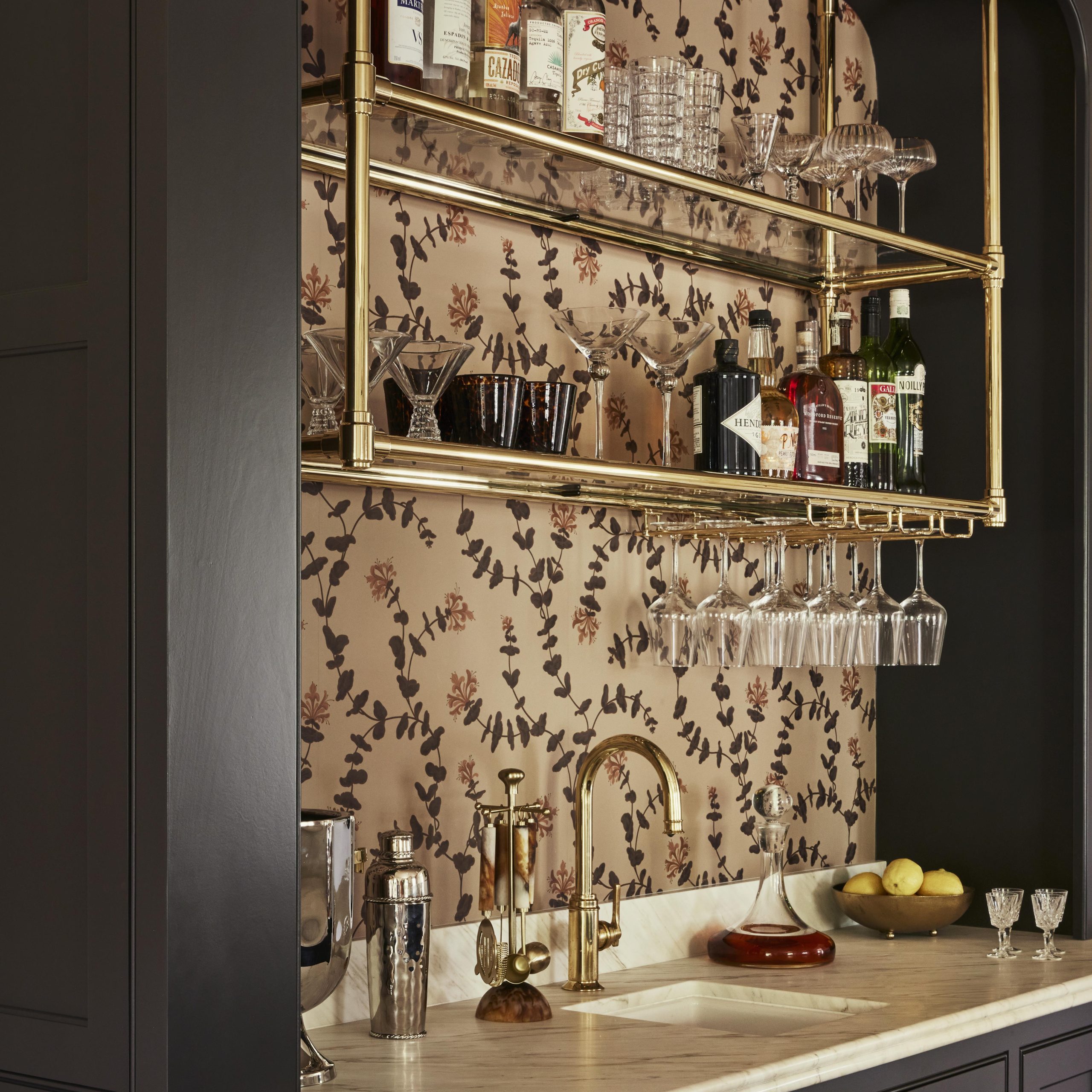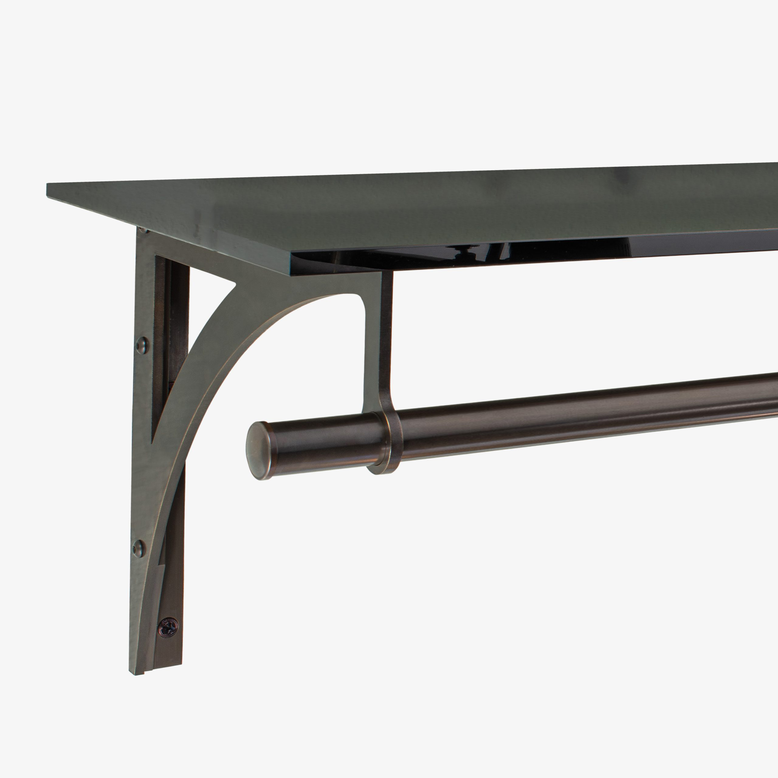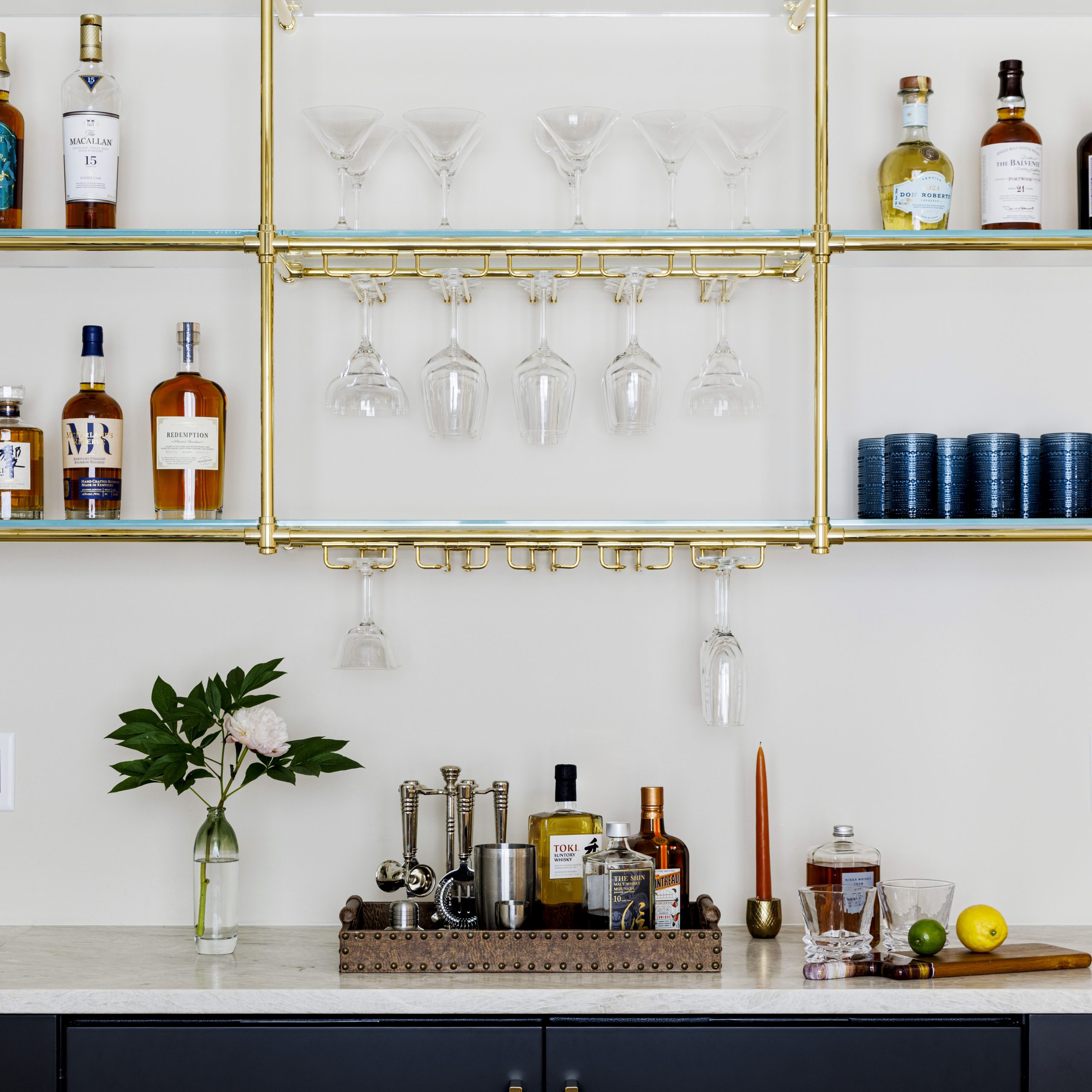 Our brass bottle rails add both function and refinement to open shelving. Custom configurations are available to suit any layout or design.